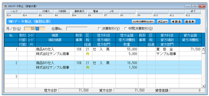 「VM1データ取込(振替伝票)」画面が開きます。科目や金額、摘要を入力します。