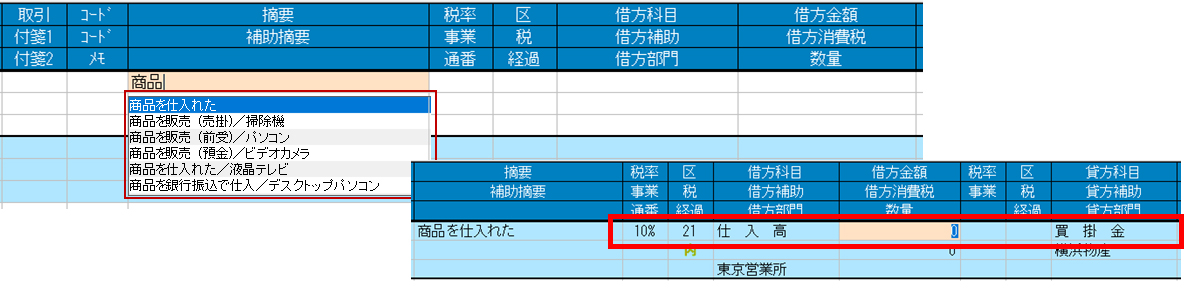 「摘要」欄の入力時にAIが過去の事例をもとに、仕訳を予測。科目や部門、税率も埋めてくれるので、入力の手間が一気に削減されます!