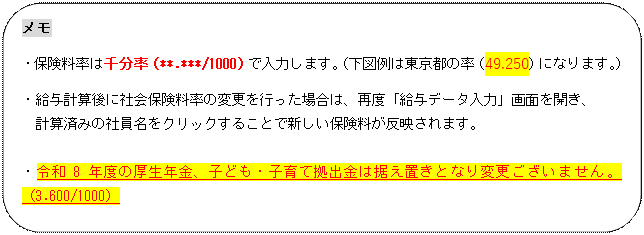 給料王では自動設定されないため、保険料率変更のタイミング(当月徴収/前月徴収)をご確認の上、該当の都道府県の率の設定を行ってください。 |
