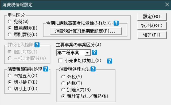 それぞれの項目を選択するだけで、消費税の申告区分や端数処理を設定できます。
