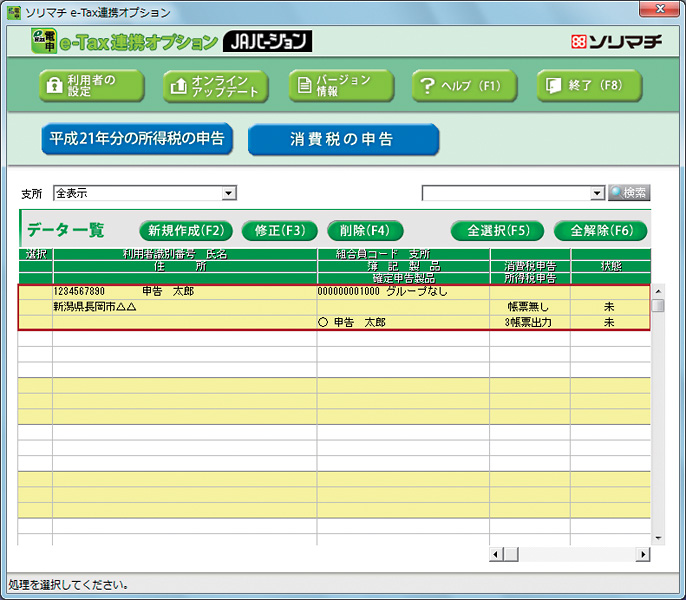 • 1. 所得税申告(確定申告JAバージョン)と消費税申告(農業簿記JAバージョン)のどちらの電子申告にも対応しています。