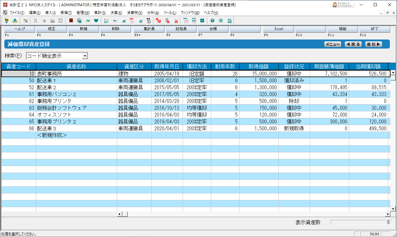 減価償却資産を登録すれば、減価償却資産集計表、減価償却資産増減総括表などで自社の償却資産の状況を一覧表示で確認できます。