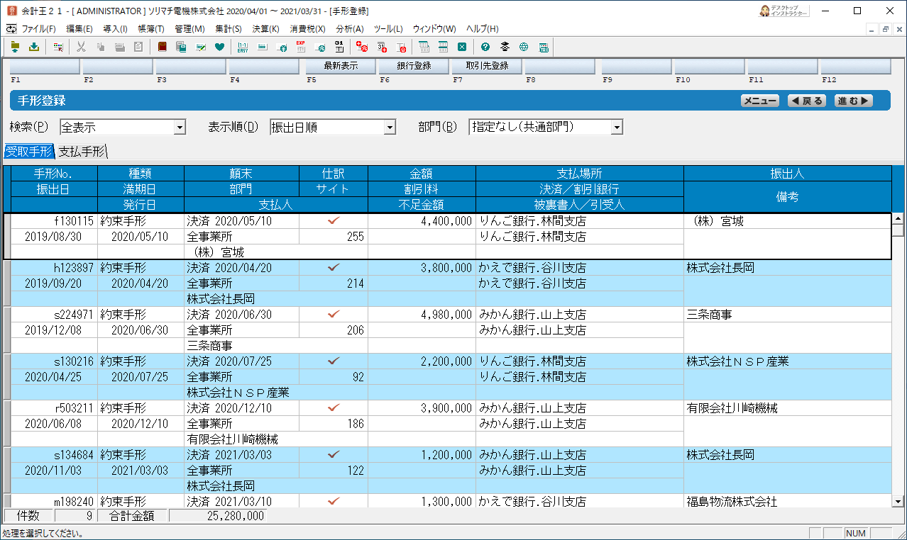 受取手形・支払手形のリストは一覧表示され、手形の回収状況が確認できます。