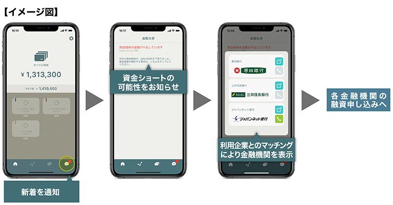 今回の機能アップにより、近い将来に資金ショートの可能性のある場合にアラートを表示し、お客様がスマホから各金融機関HP内の融資申し込みページへ遷移したり(※1)、電話をかける(※2)ことで、法人のビジネスをサポートいたします。(※3)