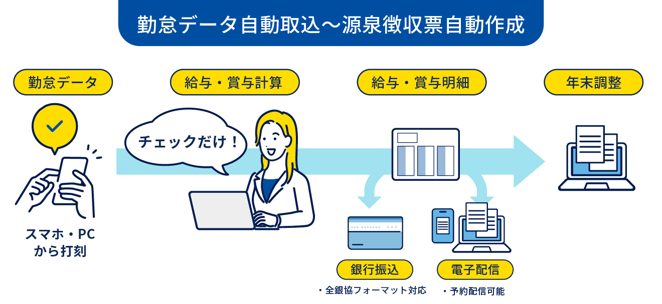 ソリマチの給料王は勤怠情報を従業員に打刻してもらい、勤怠情報をもとに給与を自動計算。年末調整まで自動化!給与担当者の苦労を軽減!毎月の給与明細は電子配信でより便利に!今まで明細の印刷や郵送にかけていた”費用”もまるごとカットでき、新たな働き方を実現。